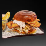 14,00€2 tiras de bacon crunch empanadas, queso americano, patatas paja y salsa de lux casera.