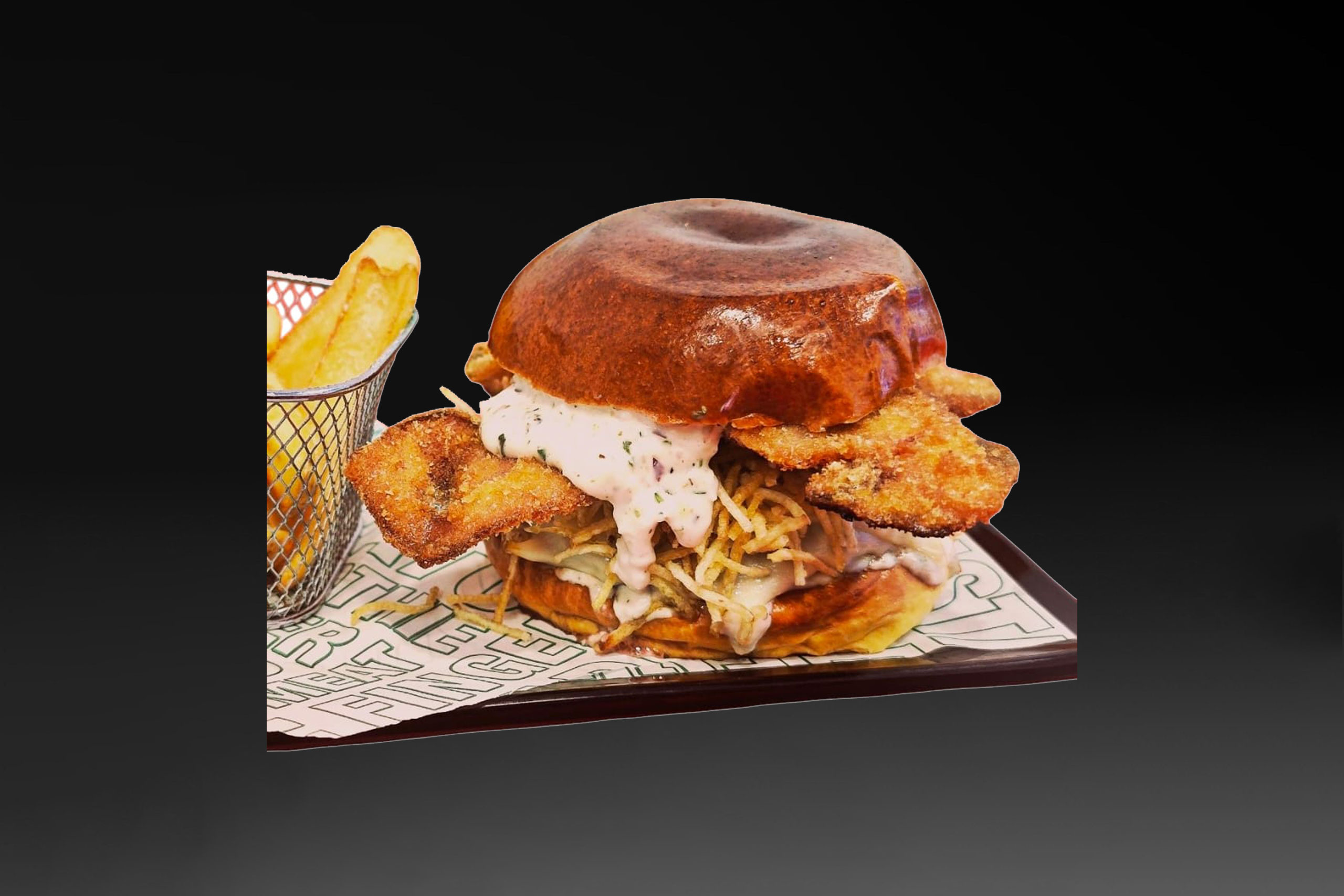 12,00€Pollo crujiente empanado, lechuga, tomate, cebolla, ali-oli, queso checar y salsa emi (un toque picante)